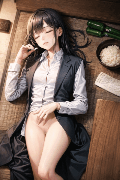 今回掲載している画像は、お酒を飲んで、スーツが乱れた状態で居酒屋で寝てしまう泥酔した2次元イラストのOLを掲載しています。