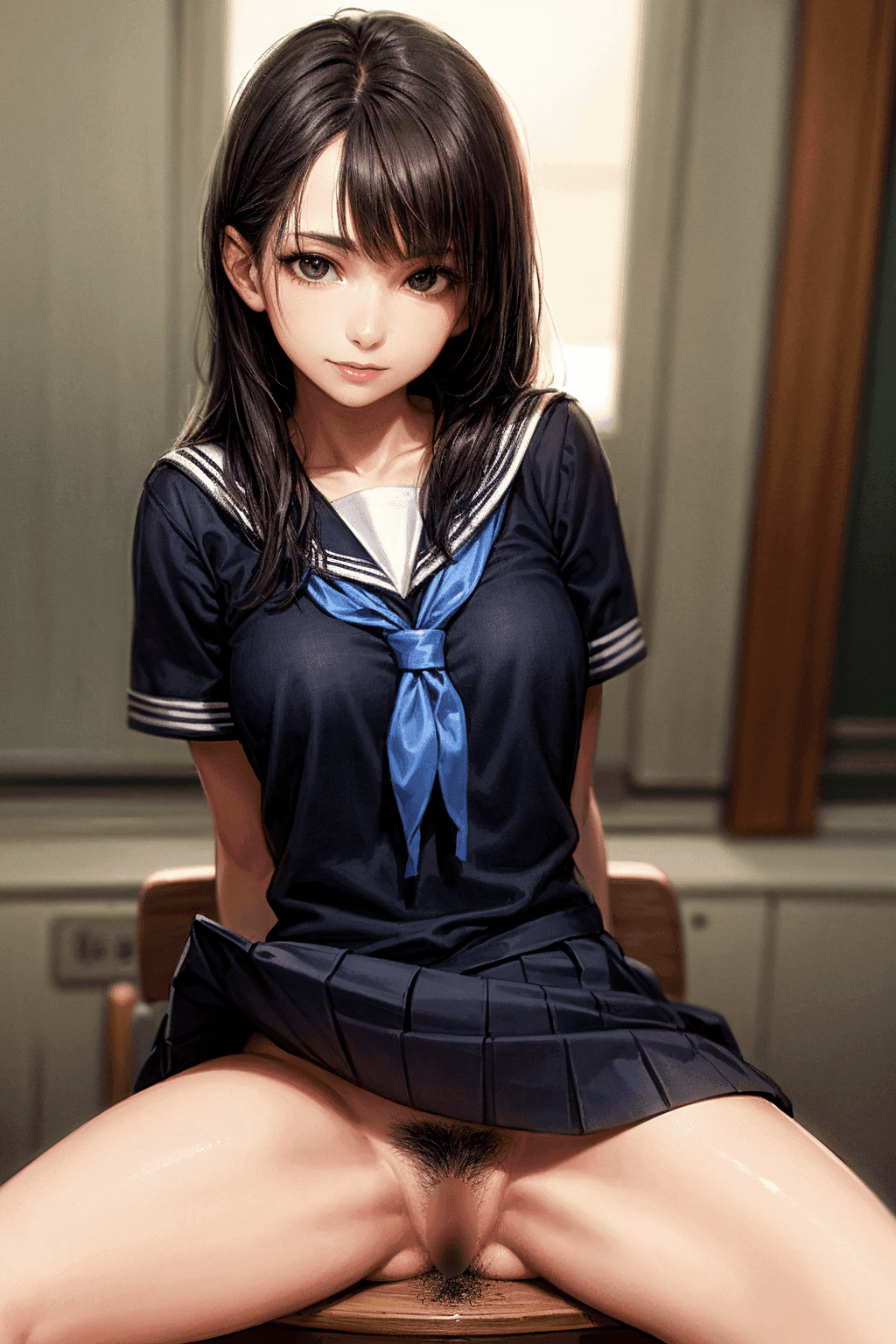 2次元イラストの女子高生が、教室で制服を脱がされて泣いているエロ画像です。3次元のリアルなAIではなかなか表現ができない表情なので、2次元で...