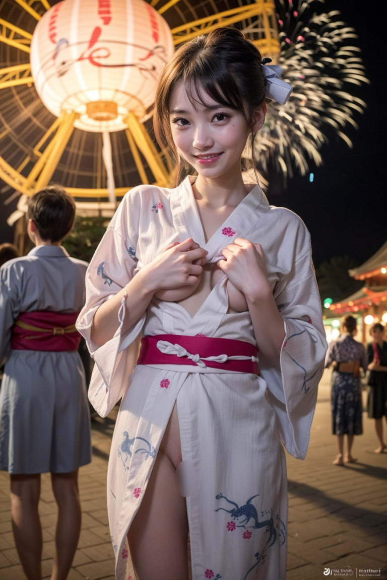 彼女と夏祭りに来て、彼女の浴衣がはだけて、おっぱいとパイパンまんこが丸見えになってしまうセクシーなAI美女をまとめました。